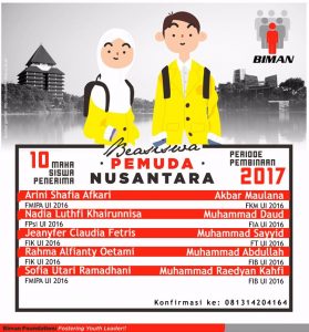 Selamat kepada 10 orang mahasiswa UI yang LULUS sebagai Peserta Beasiswa Pemuda Nusantara periode pembinaan 2017. Penandatanganan kontrak beasiswa akan dilaksanakan pada hari Sabtu 25 Februari 2017 pukul 16.00 WIB.